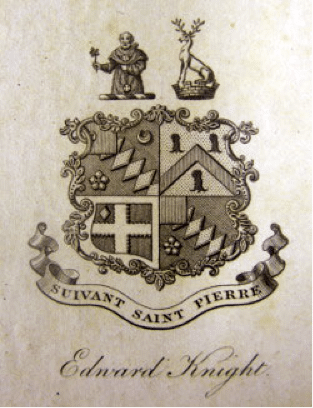 (1) This is a very brief summary of the three Knight bookplates that have been found in the books of both the Godmersham Park and Chawton Manor libraries. For a more complete history of the various families, see Chawton Manor and Its Owners: A Family History, by William Austen Leigh and Montagu George Knight, published in 1911, as well as other works in the bibliography, especially those of Edward Hepper who was very gracious in sharing all his heraldic and Knight knowledge with me.