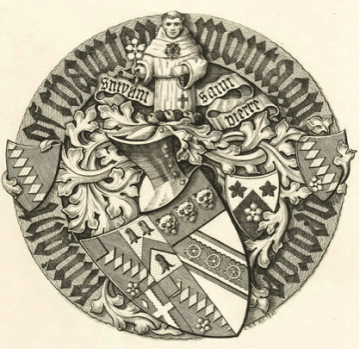 Edward also adds two crests from the Knights (the Monk) and the Austens (the Stag). The monk or friar holds a stemmed cinquefoil in his right hand (this was originally a lantern but was changed with the Brodnax connection) with a bracelet of beads (a rosary) and a cross hanging from his left hand, the cross a symbol of faith and the Church. A red rose (a symbol of grace, beauty, and sometimes martyrdom) was also added to the monk’s robe.