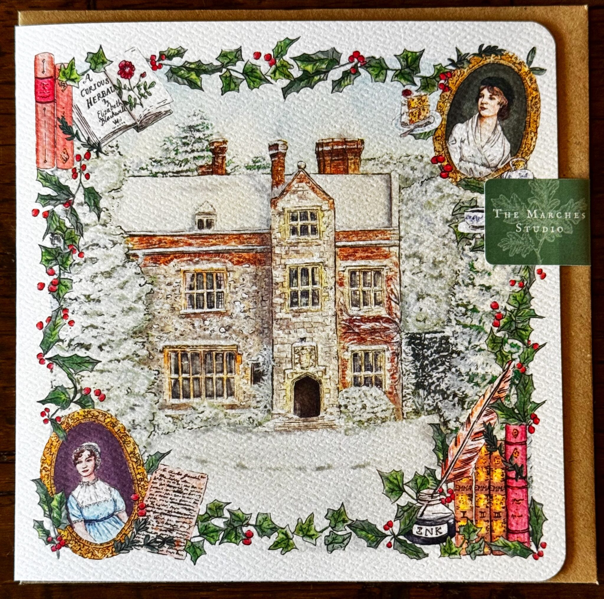 A beautifully illustrated blank greeting card depicting a festive and snow-covered Chawton House, along with some of the highlights in our collection.